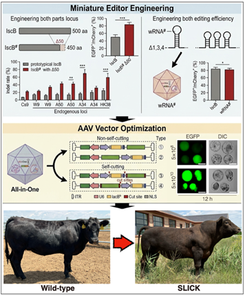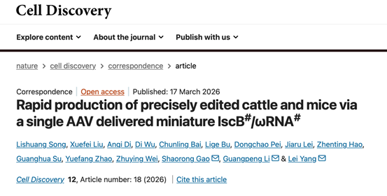 2026年3月17日,内蒙古大学杨磊、李光鹏教授与同济大学高绍荣院士团队再度携手攻关,在Nature子刊《Cell Discovery》(IF=13)发表研究论文,通过改造获得高效低脱靶的微型IscB#/ωRNA#编辑工具,构建出All-in-One全新AAV递送体系,实现受精卵无显微操作的直接精准编辑,成功获得抗热应激SLICK基因编辑牛,为反刍家畜精准育种开辟了极简高效新路径。